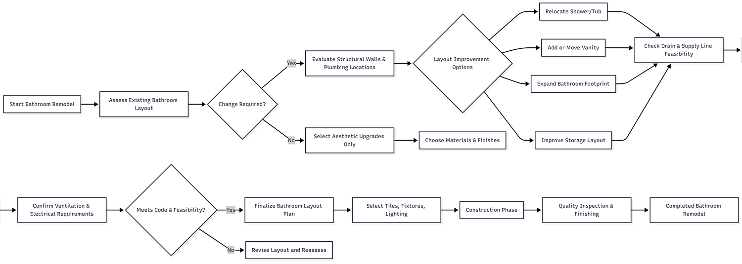 Bathroom remodeling projects typically include layout reconfiguration, fixture replacement, plumbing updates, waterproofing, tile installation, custom cabinetry, lighting improvements, and luxury upgrades. Each component must be planned precisely, ensuring the space performs beautifully for years to come.